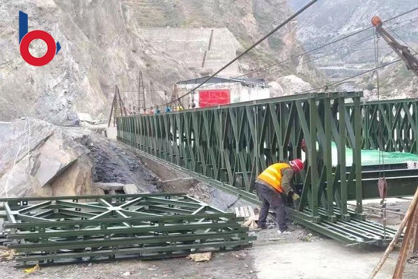 江蘇貝雷鋼橋有限公司派專門的技術(shù)人員前往甘肅省甘南藏族自治州迭部縣,架設(shè)橋型四排單層加強(qiáng)型(QSR)鋼橋,貝雷鋼橋架設(shè)的鋼橋使用200型產(chǎn)品,全橋長(zhǎng)45.72米,屬于單跨橋,整個(gè)橋面凈寬 4.2米,荷載55噸。